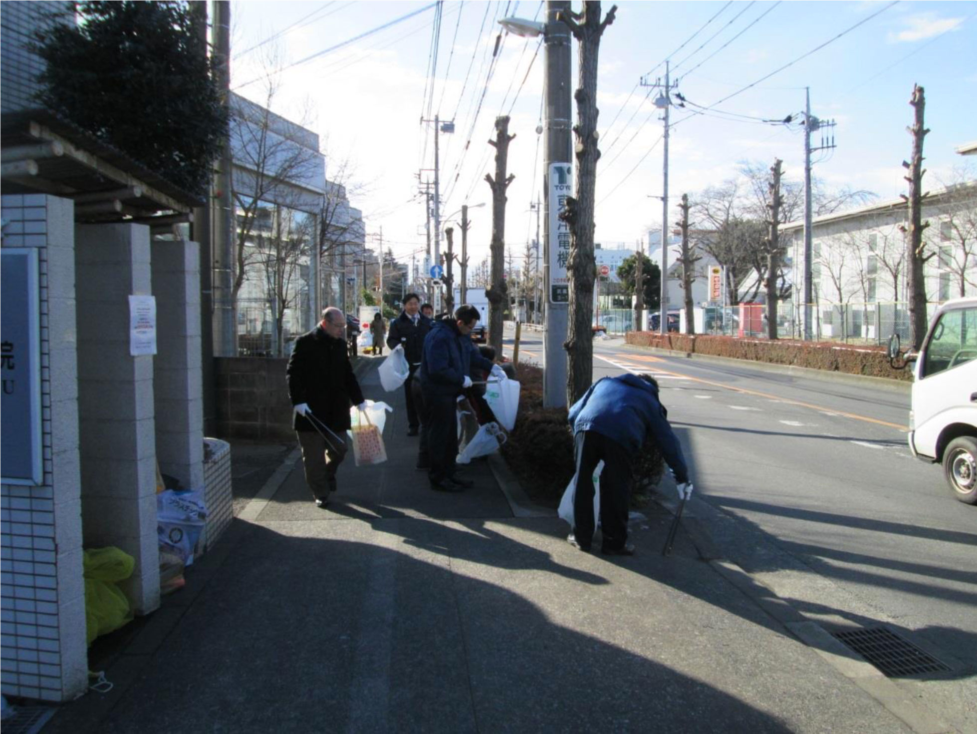 参加された事業者の方々が各々にボランティア袋(可燃と不燃)とトングを手に持ち、つつじが丘交差点から松中橋に向かって東側の歩道を、また、松中橋からつつじが丘交差点に向かって西側の歩道に落ちているごみを拾って歩きました。