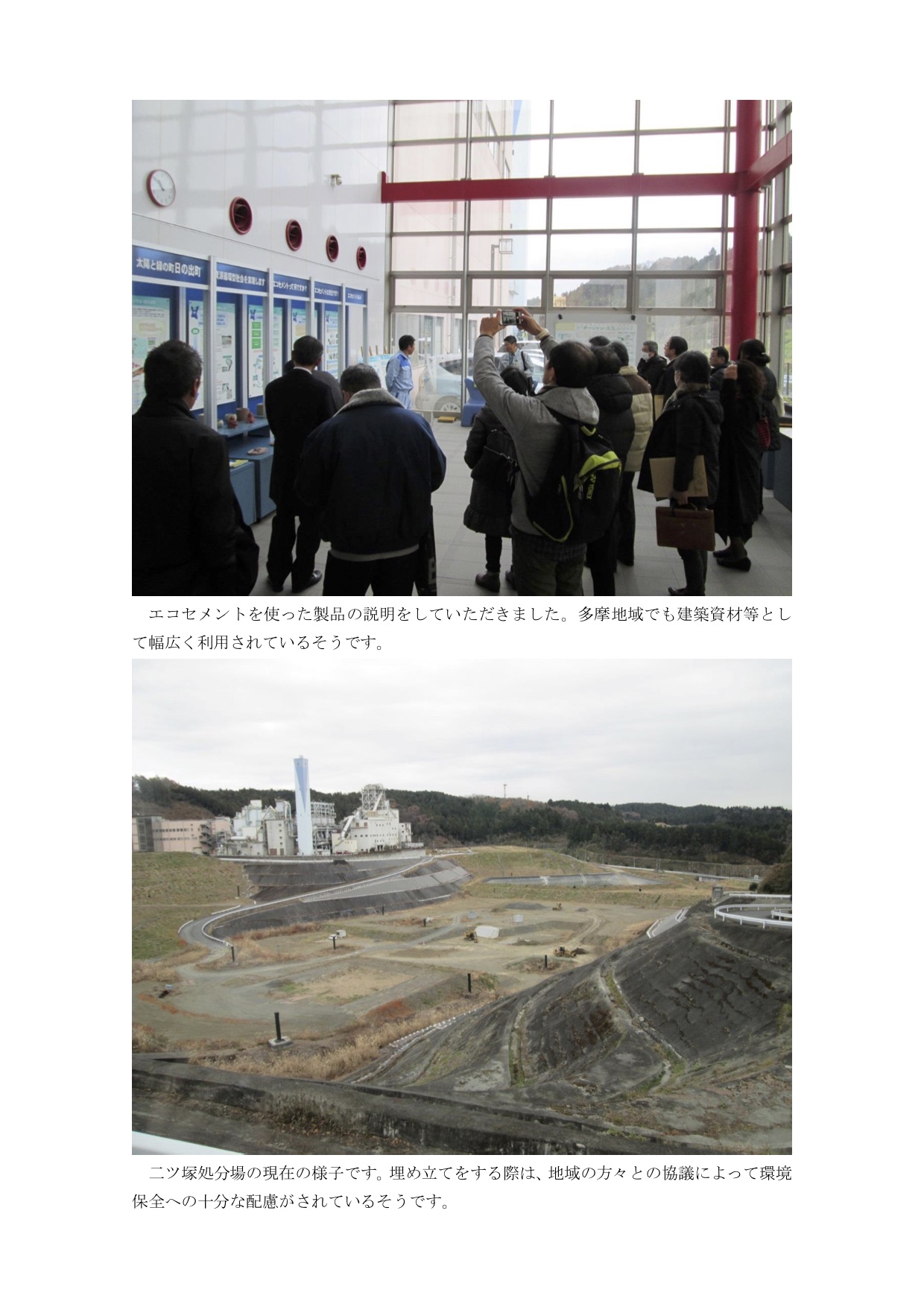4.午前中は東京たま広域資源循環組合様にお伺いしました。広大な敷地の中にあるエコセメント化施設を案内していただき、エコセメントの製造工程を見学してきました。この施設が稼働されたことによって処分場の埋立量がかなり抑えられたというお話を伺い、改めてごみ減量に向けた取組の重要性を実感するとともに、埋め立てが終了した谷戸沢処分場跡地の自然回復力の凄さに驚きました。